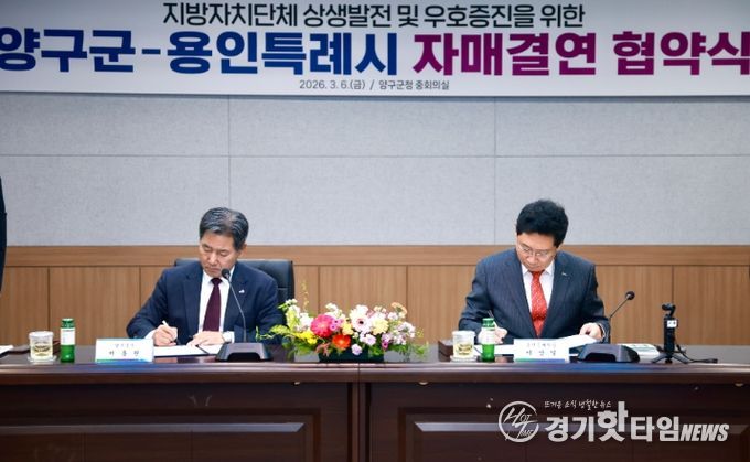 [경기핫타임뉴스=김삼영 기자] 용인특례시는 6일 강원특별자치도 양구군과 자매결연을 하고, 두 도시의 교류와 발전을 위해 적극 협력하기로 했다.