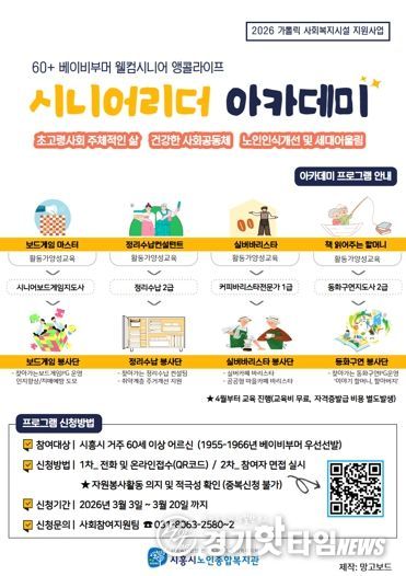 [경기핫타임뉴스=김삼영 기자] 시흥시노인종합복지관은 천주교수원교구의 지원을 받아 베이비부머 세대를 위한 전문자격 양성과정 ‘시니어리더 아카데미’를 오는 4월부터 운영하는 가운데, 참가 어르신을 모집한다.