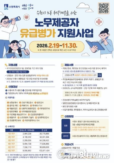 수원시는 11월 30일까지 ‘2026년 노동취약계층 노무 제공자 유급병가 지원사업’ 신청을 받는다.