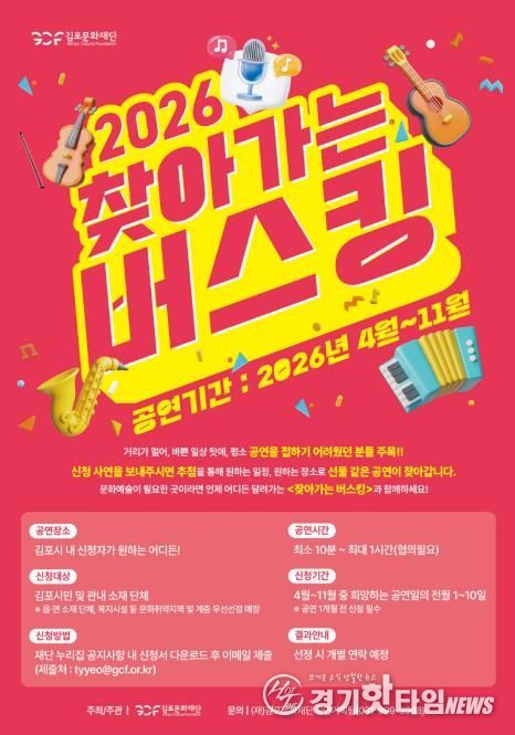 [경기핫타임뉴스=김형철 기자] (재)김포문화재단은 시민들의 일상 속 문화예술 향유 기회 확대를 위한 ‘2026 찾아가는 버스킹’ 공연 관람 희망 단체를 모집한다고 밝혔다.