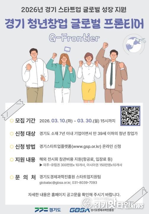 [경기핫타임뉴스=김삼영 기자] 경기도와 경기도경제과학진흥원은 도내 청년 창업가들의 글로벌 시장 진출의 시작을 돕는 ‘경기 청년창업 글로벌 프론티어(G-Frontier)’ 참여기업 20개사를 오는 30일까지 모집한다.