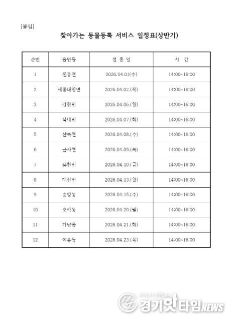 이번 서비스는 춘계 광견병 예방접종 기간에 맞춰 진행되며, 읍·면·동별 지정된 운영 일정(별첨)에 따라 행정복지센터 접수 창구를 방문해 신청서를 작성하면 된다. 동물등록은 외장형 무선식별장치를 부착하게 되며, 반려동물 소유주는 3,000원의 수수료를 납부하면 된다.