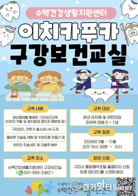 [경기핫타임뉴스=김형철 기자] 구리시는 수택건강생활지원센터에서 미취학 아동의 올바른 구강 관리 습관 형성과 치아우식증 예방을 위해 관내 유치원과 어린이집 아동을 대상으로'이치카푸카 구강보건 교실'을 2026년 3월부터 11월 말까지 운영한다고 밝혔다.