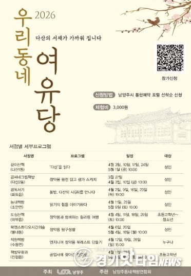 [경기핫타임뉴스=김형철 기자] 남양주시는 오는 27일부터 시민이 생활과 밀접한 동네 책방에서 다산 정약용을 접할 수 있도록 ‘우리동네 여유당’ 프로그램을 운영한다고 10일 밝혔다.