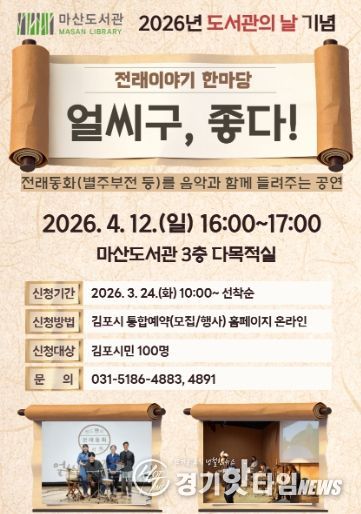 [경기핫타임뉴스=김형철 기자] 김포시 마산도서관은 제4회 도서관의 날을 맞아 오는 4월 12일 오후 4시부터 5시까지 마산도서관 3층 다목적실에서 전래이야기 한마당 '얼씨구, 좋다!'를 운영한다.
