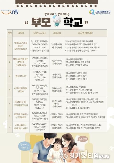 [경기핫타임뉴스=김삼영 기자] 시흥시는 이달부터 오는 6월까지 관내 학부모 및 예비 학부모를 대상으로 부모 역량 강화를 위한 ‘찾아가는 부모학교’를 총 7개 과정, 20회에 걸쳐 운영한다.