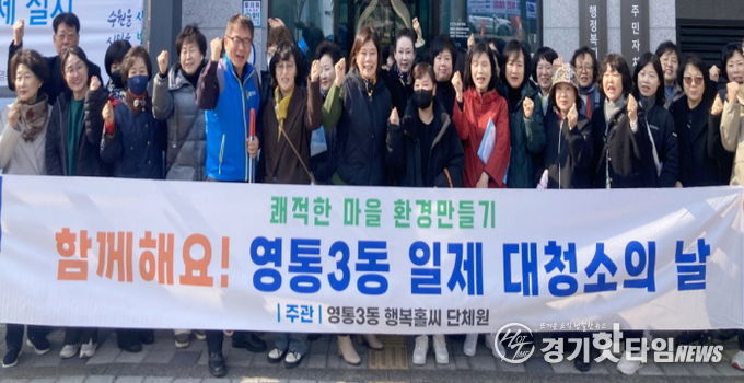 [경기핫타임뉴스=김삼영 기자] 수원시 영통구 영통3동 행정복지센터는 지난 12일 새봄을 맞아 쾌적하고 깨끗한 마을 환경 조성을 위해 통장협의회와 함께 ‘새봄맞이 일제 대청소의 날’을 실시했다.