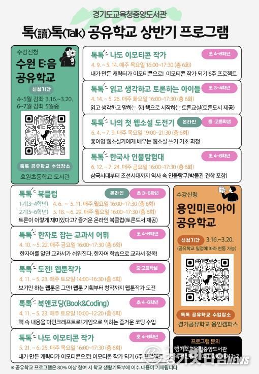 [경기핫타임뉴스=김삼영 기자] 경기도교육청중앙도서관이 학생들의 창의적 사고력과 진로설계 역량을 강화하기 위해 4월부터 7월까지 녪년 상반기 톡(讀)톡(talk) 공유학교’를 운영한다.