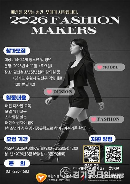 [경기핫타임뉴스=김삼영 기자] 수원시청소년청년재단 권선청소년청년센터는 패션 분야 진로에 관심 있는 청소년과 청년을 대상으로 ‘패션메이커스(Fashion Makers)’ 프로그램 참가자를 모집한다.