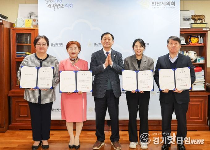 시의회는 17일 의장실에서 박태순 의장과 신임 소식지 편집위원들이 참석한 가운데 수여식을 개최하고 현옥순 의회 의회운영위원회 부위원장과 장기준 투데이안산 대표, 우인경 이동 지역사회보장협의체 위원, 이은빈 의회 입법지원팀 정책지원관 등 4명을 소식지 편집위원으로 위촉했다.