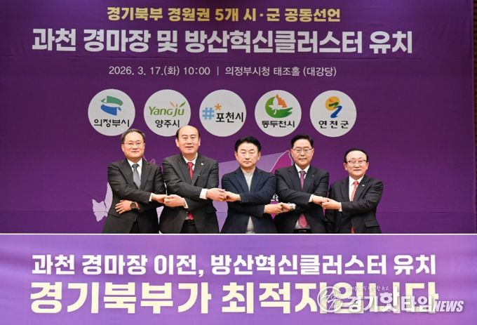 [경기핫타임뉴스=김형철 기자] 양주시는 17일 의정부시청 대강당에서 의정부·포천·동두천시·연천군과 함께 ‘과천경마공원 이전 및 방산혁신클러스터 경기북부 유치’를 위한 공동 선언문을 발표했다.