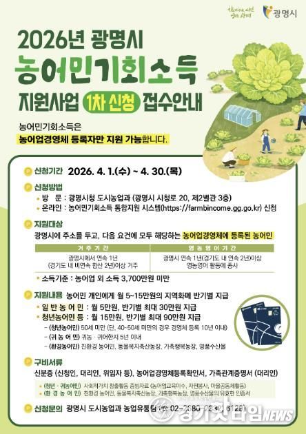 [경기핫타임뉴스=김삼영 기자] 광명시는 오는 4월 1일부터 4월 30일까지 ‘농어민 기회소득 지원사업 1차’ 신청을 받는다.