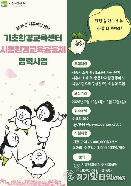 [경기핫타임뉴스=김삼영 기자] 시흥시는 지역 공동체 간 협력을 바탕으로 환경교육을 활성화하고, 환경교육 네트워크를 강화하기 위해 ‘2026년 기초환경교육센터-시흥환경교육공동체 협력사업’을 추진한다.