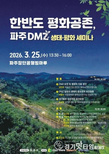 [경기핫타임뉴스=김형철 기자] 파주시는 오는 25일 13시부터 16시까지 파주장단콩웰빙마루(탄현면 필승로 396) 2층에서 ‘한반도 평화공존, 파주 디엠지(DMZ) 생태·평화 세미나’를 개최한다.