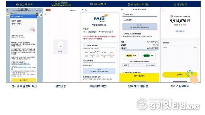 [경기핫타임뉴스=김형철 기자] 파주시는 지방세 체납액 징수율을 제고하기 위해 도입한 '체납 안내 카카오 알림톡 모바일 전자고지 서비스'가 뚜렷한 성과를 거두고 있다.
