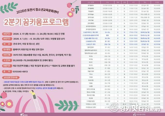 모집 대상은 관내 유아·청소년·성인이며, 신청은 3월 24일 오후 6시까지 포천시청소년교육문화센터 누리집을 통해 선착순으로 진행된다.