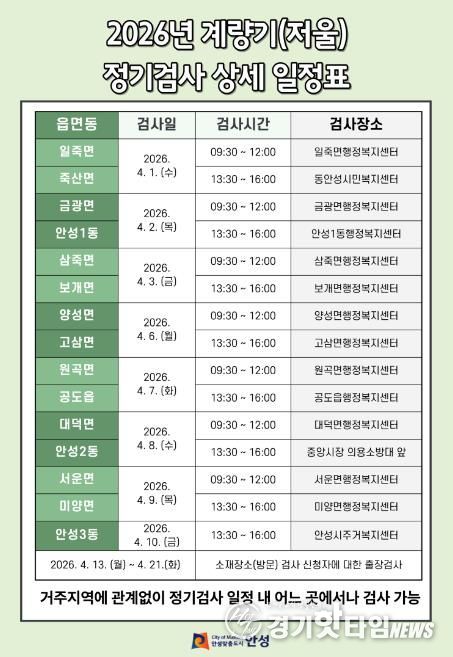 정기검사는 4월 1일부터 10일까지 읍·면·동 순회검사 방식으로 진행되며 검사 장소는 각 행정복지센터를 비롯해 안성시 주거복지센터와 안성중앙시장 등이다.