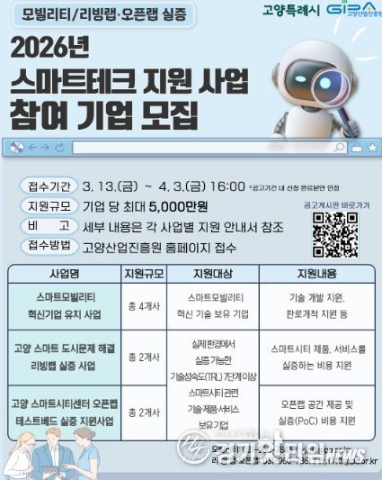 이번 모집은 ▲ 고양 스마트시티센터 오픈랩 테스트베드 실증 지원 사업 ▲ 고양 스마트 도시문제 해결 리빙랩 실증 사업 ▲ 스마트 모빌리티 혁신기업 유치 사업 세 분야로 진행된다.