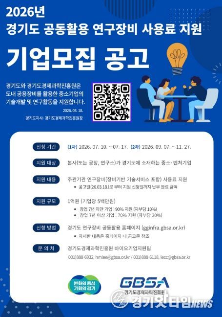 [경기핫타임뉴스=김삼영 기자] 경기도와 경기도경제과학진흥원이 도내 중소·벤처기업의 연구개발(R&D) 경쟁력 강화를 위해 ‘2026년 경기도 공동활용 연구장비 사용료 지원 사업’을 추진한다.