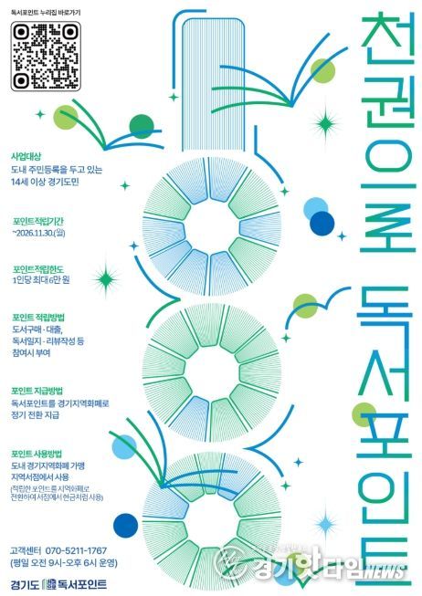 윤명희 경기도서관장은 “책을 읽는 경험이 생활 속 혜택으로 이어지도록 경기도 대표 독서문화 프로젝트인 ‘천권으로’와 연계해 독서포인트 사업을 설계했다”면서 “경기도민이 책과 함께 걷는 평생 독서의 길을 함께 하길 바란다”고 말했다.