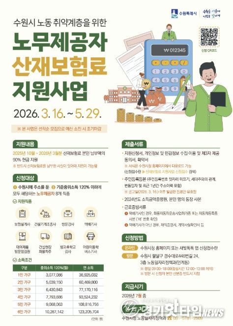 [경기핫타임뉴스=김삼영 기자] 수원특례시는 5월 29일까지 ‘2026년 상반기 노동 취약계층 노무제공자 산재보험료 지원사업’ 신청을 받는다.