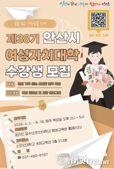 [경기핫타임뉴스=김삼영 기자] 안산시는 지역 여성의 역량 강화와 리더십 함양을 위한 ‘제38기 안산시 여성자치대학’ 수강생을 모집한다고 20일 밝혔다.