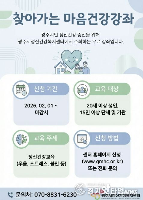 [경기핫타임뉴스=김삼영 기자] 광주시정신건강복지센터는 지역 내 기관 및 단체를 대상으로 정신건강 인식 향상과 정신질환 예방을 위한 ‘2026년 찾아가는 마음 건강 강좌’를 오는 11월까지 운영한다고 20일 밝혔다.