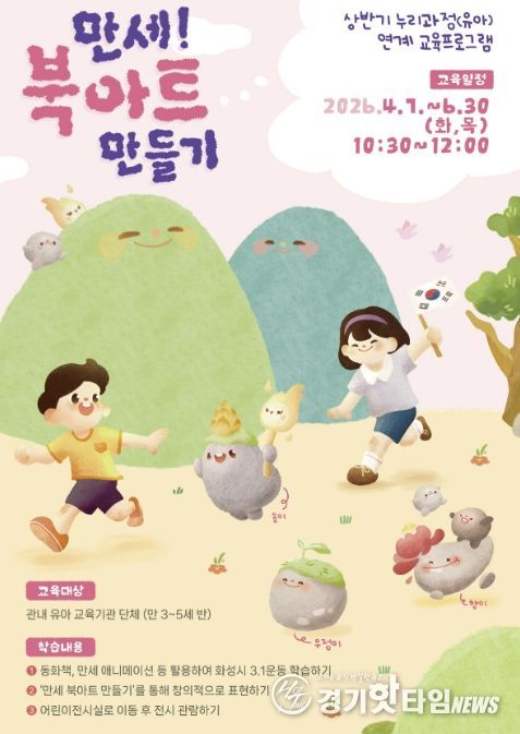 [경기핫타임뉴스=김삼영 기자] 화성특례시 화성시독립운동기념관은 관내 유아 교육기관을 대상으로 교육프로그램 ‘만세! 북아트 만들기’를 4월 7일부터 6월 30일까지 매주 화요일과 목요일에 운영한다.