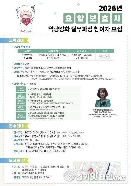 [경기핫타임뉴스=김형철 기자] 양주시일자리센터가 오는 3월 31일부터 4월 3일까지 2026년 취업지원프로그램 ‘요양보호사 역량강화 실무과정’ 교육생을 모집한다.