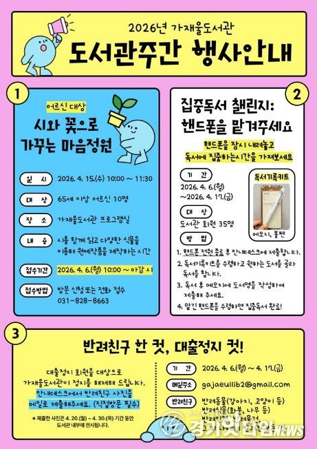[경기핫타임뉴스=김형철 기자] 의정부가재울도서관은 4월 도서관주간을 맞아 시민들이 책과 도서관을 더욱 친숙하게 느낄 수 있도록 프로그램과 이벤트를 운영한다.