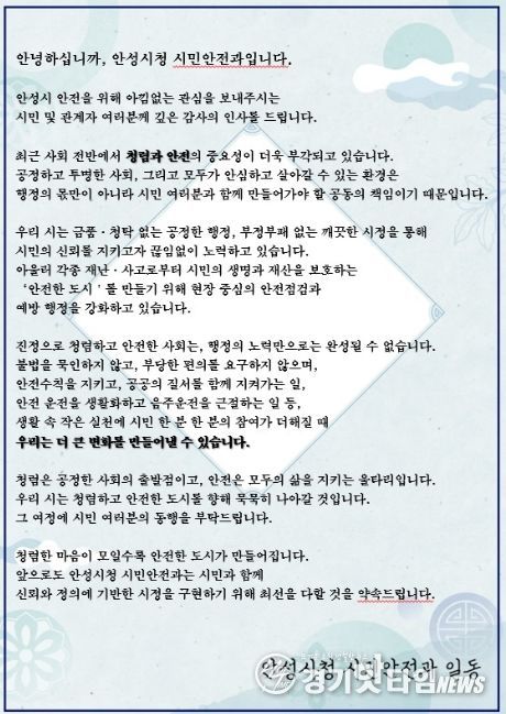 [경기핫타임뉴스=김삼영 기자] 안성시는 각종 안전점검 과정에서 청렴 안내문을 배부하는 ‘청렴한 안전점검’을 추진하며 시민 청렴의식 제고에 나선다.