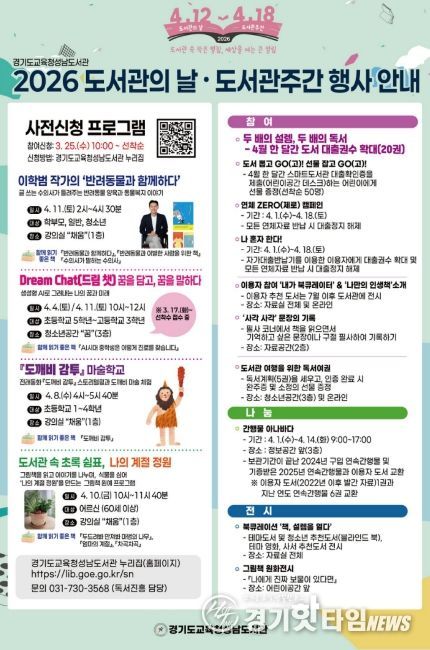 [경기핫타임뉴스=김삼영 기자] 경기도교육청성남도서관이 2026년 도서관의 날(4월 12일)과 도서관 주간(4월 12일~18일)을 맞아 다양한 독서·문화행사를 운영한다.