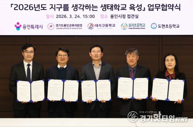 [경기핫타임뉴스=김삼영 기자] 용인특례시는 24일 시청 접견실에서 용인교육지원청을 비롯해 3개 학교와 ‘지구를 생각하는 생태학교 육성사업’을 위한 협약을 맺었다.