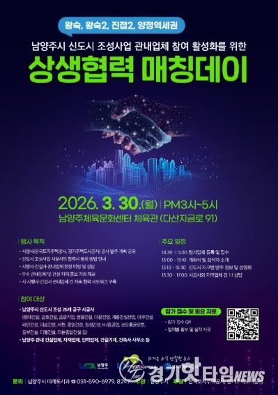 시 관계자는 “이번 자리를 통해 시행사·건설사와 관내 기업이 서로를 신뢰할 수 있는 파트너로 인식하는 자리가 되길 바란다”며 “남양주가 성장하는 만큼 우리 지역 기업도 함께 성장할 수 있도록 행정적 가교 역할을 끝까지 수행하겠다”고 전했다.