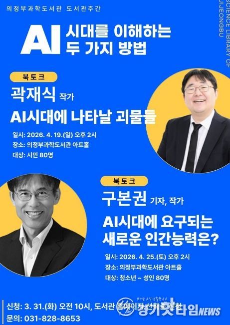 [경기핫타임뉴스=김형철 기자] 의정부과학도서관은 ‘제62회 도서관주간’과 ‘제4회 도서관의 날’을 맞아 4월 19일부터 30일까지 ‘AI 시대를 이해하는 두 가지 방법’을 주제로 시민 대상 작가 북토크를 개최한다.