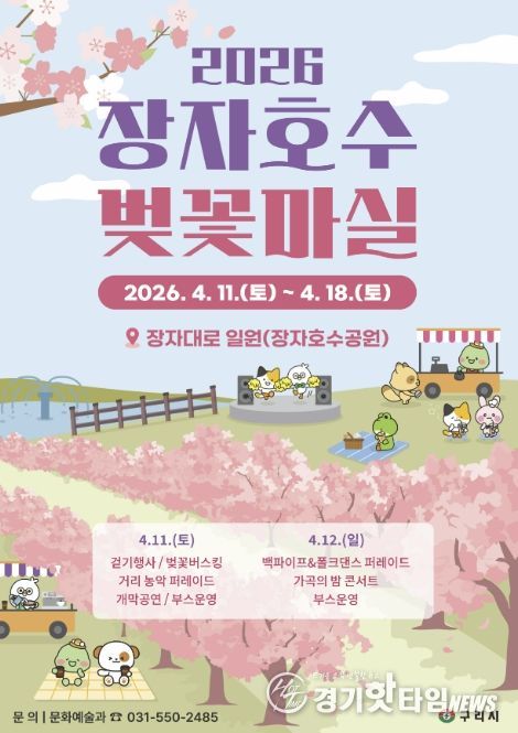 [경기핫타임뉴스=김형철 기자] 구리시는 오는 4월 11일부터 18일까지 8일간 장자대로 일원(장자호수공원)에서 ‘2026 장자호수 벚꽃마실’을 개최한다고 밝혔다.