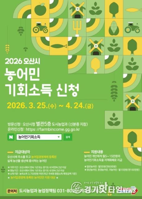 [경기핫타임뉴스=김삼영 기자] 오산시는 농업·농촌의 공익적 가치 보장과 농어촌 소멸위기 대응을 위해 ‘2026년 농어민 기회소득’ 신청·접수를 3월 25일부터 4월 24일까지 진행한다고 밝혔다.
