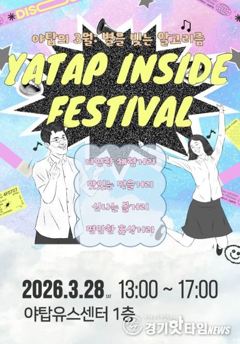 [경기핫타임뉴스=김삼영 기자] 성남시청소년청년재단 야탑유스센터는 오는 3월 28일 오후 1시부터 야탑유스센터 1층 로비와 광장에서 청소년과 청년, 지역주민이 함께 즐기는 체험형 축제 ‘2026 [YATAP INSIDE - 안에 다 있다] 야탑의 3월: 별을 빚는 알고리즘’을 개최한다.