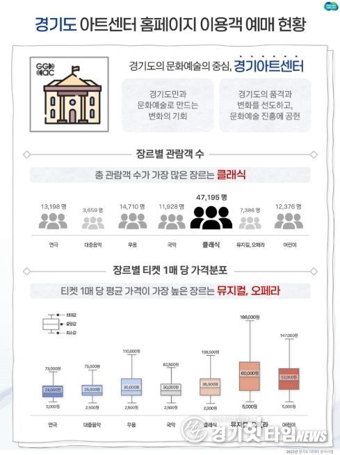 경기아트센터 공연 예매 데이터 분석에서는 클래식 장르 관람객이 약 4만 7천 명으로 가장 높은 선호도를 보였다. 도는 이러한 데이터를 향후 수요자 맞춤형 공연 기획의 기초 자료로 활용할 계획이다.