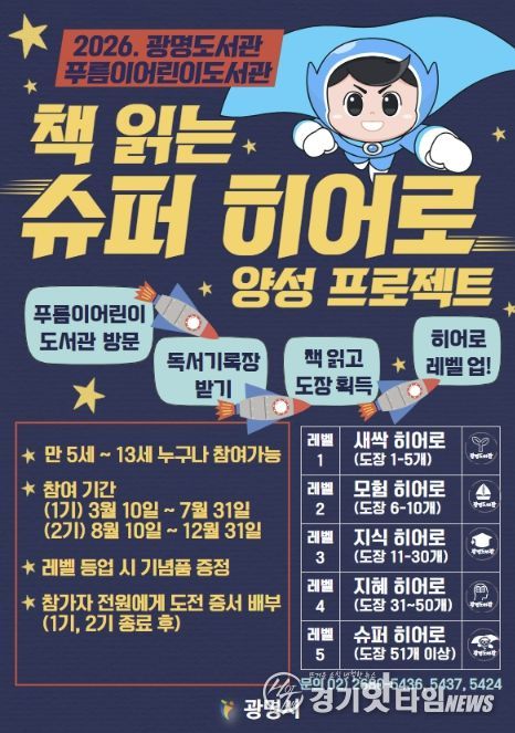 [경기핫타임뉴스=김삼영 기자] 광명시 광명도서관은 어린이들의 자발적인 독서 습관 형성과 도서관 이용 활성화를 위해 3월부터 푸름이어린이도서관에서 ‘책 읽는 슈퍼 히어로(Hero)’ 성장 프로젝트를 계속 운영한다.