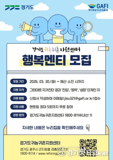 [경기핫타임뉴스=김삼영 기자] 경기도와 경기도농수산진흥원이 운영하는 경기도귀농귀촌지원센터는 경기도로 귀농·귀촌을 희망하는 도시민과 초기 정착 단계의 귀농귀촌인을 대상으로 ‘2026년 귀농귀촌 행복멘토링 행복멘티’를 상시 모집한다.