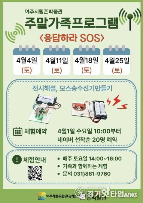 [경기핫타임뉴스=김형철 기자] 여주세종문화관광재단 여주시립 폰박물관은 오는 4월 4일부터 25일까지 매주 토요일, 가족과 함께하는 주말 체험 프로그램'응답하라 SOS'를 진행한다.