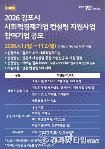 [경기핫타임뉴스=김형철 기자] 김포시가 관내 사회적경제기업의 지속 가능한 성장과 자생력 강화를 위해 ‘사회적경제기업 역량강화 컨설팅 지원사업’ 참여기업을 오는 11월까지 수시 모집한다.