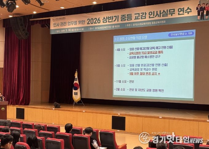 [경기핫타임뉴스=김삼영 기자] 경기도수원교육지원청은 3월 30일 경기도보훈교육연구원에서 관내 중·고등학교 인사업무 담당자(교감)를 대상으로 연수를 실시했다. 이를 통해 교원 인사관리 전반에 대한 이해도를 제고하고, 실무 중심의 업무 수행 역량을 강화했다.