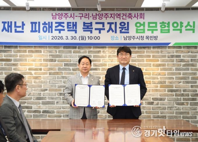 [경기핫타임뉴스=김형철 기자] 남양주시는 30일 구리‧남양주지역건축사회와 재난으로 주택 피해를 입은 시민의 신속한 주거 안정을 지원하기 위한 ‘재난 피해 주택 신축 지원 업무협약’을 체결했다고 밝혔다.