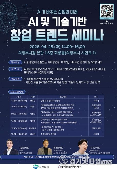 [경기핫타임뉴스=김형철 기자] 의정부시는 ‘2026 첨단산업 스케일업’ 사업의 일환으로 4월 인뎁스(In-depth) 네트워킹과 AI‧기술기반 창업 트렌드 세미나를 개최하고 참여 기업과 시민을 모집한다.