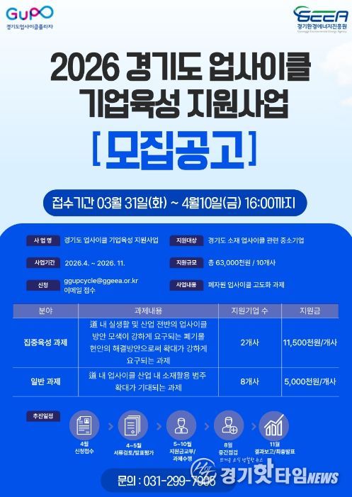 [경기핫타임뉴스=김삼영 기자] 경기환경에너지진흥원이 업사이클 기업을 발굴해 기술 고도화와 사업화를 돕는 ‘경기도 업사이클 기업육성 지원사업’ 참여기업을 10일까지 모집한다.
