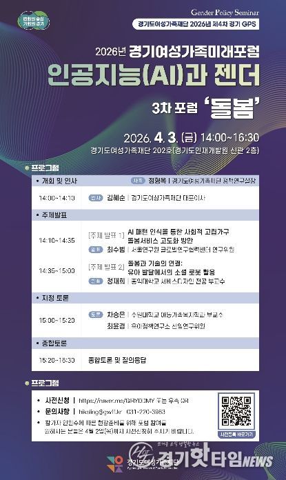 [경기핫타임뉴스=김삼영 기자] 경기도여성가족재단은 3일 재단 회의실에서 ‘인공지능과 돌봄’을 주제로 경기여성가족미래포럼을 개최한다. 3월부터 5월까지 총 5차례 진행하는 경기여성가족미래포럼 중 이번이 3회차다.