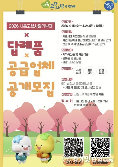 [경기핫타임뉴스=김삼영 기자] 시흥시는 고향사랑기부제 활성화와 지역 특색을 반영한 답례품 발굴을 위해 ‘2026년 고향사랑기부제 답례품 및 공급업체’를 공개 모집하며 4월 15일부터 24일까지 10일간 신청ㆍ접수를 받는다.