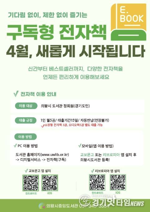 [경기핫타임뉴스=김삼영 기자] 의왕시가 4월부터 시민의 정보 접근성을 높이고 디지털 독서문화 확산을 위해 ‘구독형 전자책 서비스’와 ‘온라인 학술 데이터베이스(DBpia) 서비스’를 도입한다.